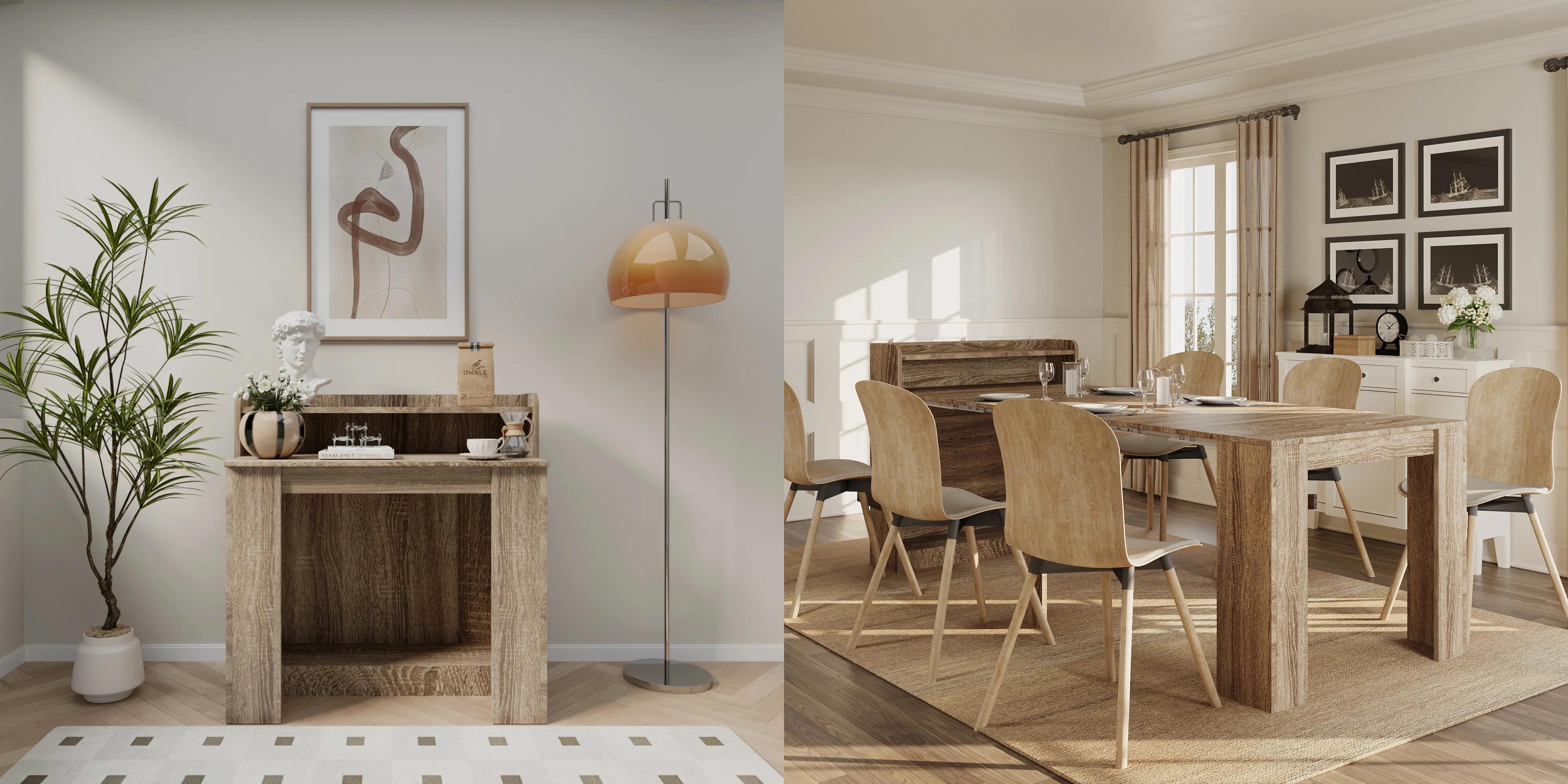 This table is a lifesaver for compact dining rooms or open-plan spaces where every inch counts. When closed, it fits neatly against a wall or in a corner as an extendable console table—perfect for working from home or displaying décor. When guests come over, it expands effortlessly into a full-sized extendable dining room table.