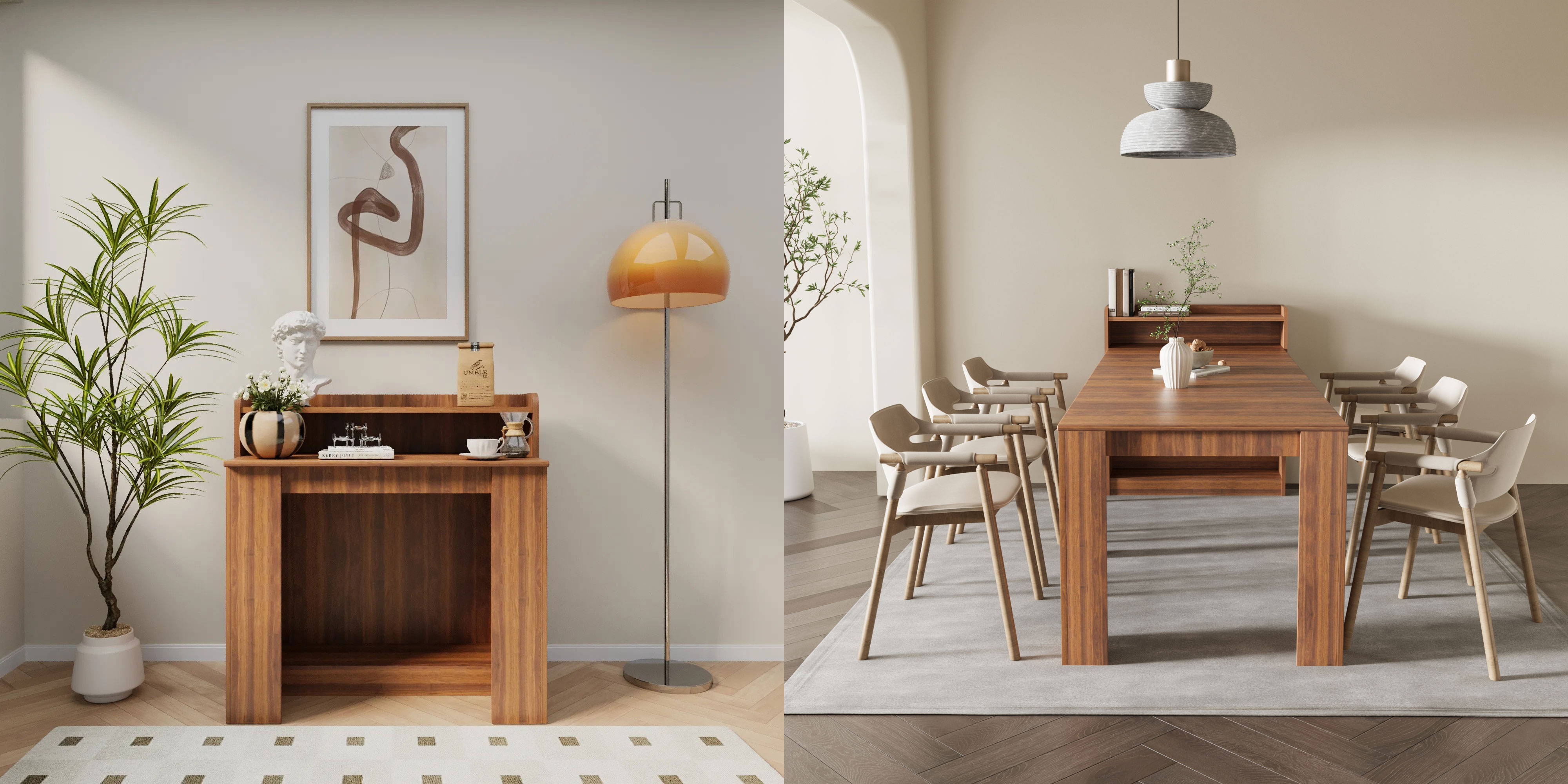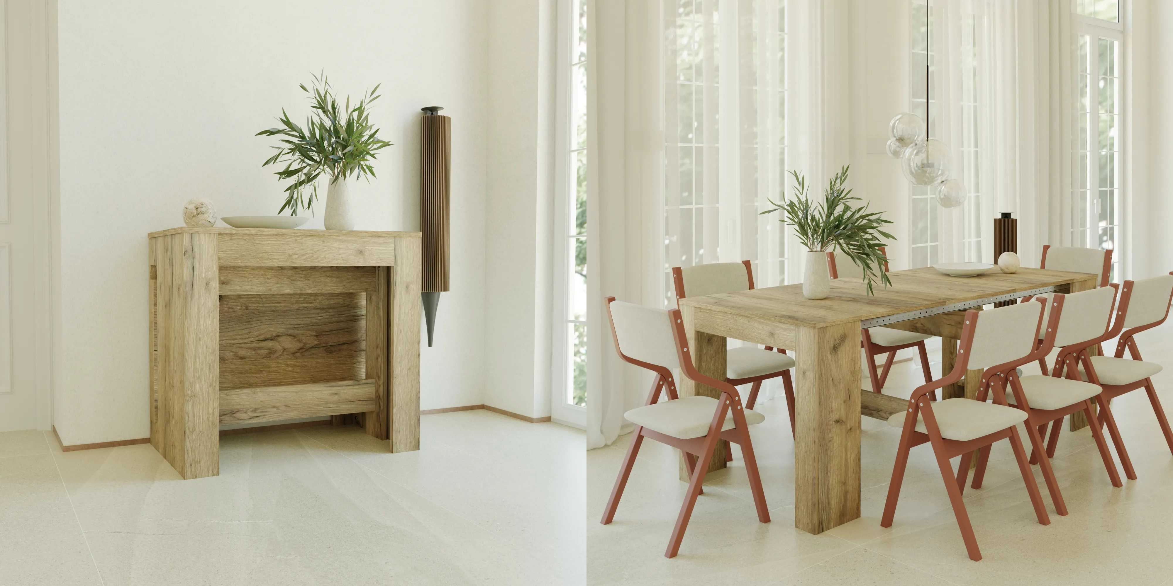 If you want the flexibility of an extendable table but don’t want a table that feels too large for everyday use, consider a space-saving extendable console table. For instance, JOYSOURCE’s Space-Saving Extendable Console to Dining Table can be transformed from a compact console table into a full-sized dining table that seats up to 8 people. You can use the table when it's small for your morning coffee, you can work from home on your laptop, or you can have a casual dinner with only your family. The leaves can just be put away until you need them, and then they can be in your house as a perfect-sized table, not just a table you pull out for the party.