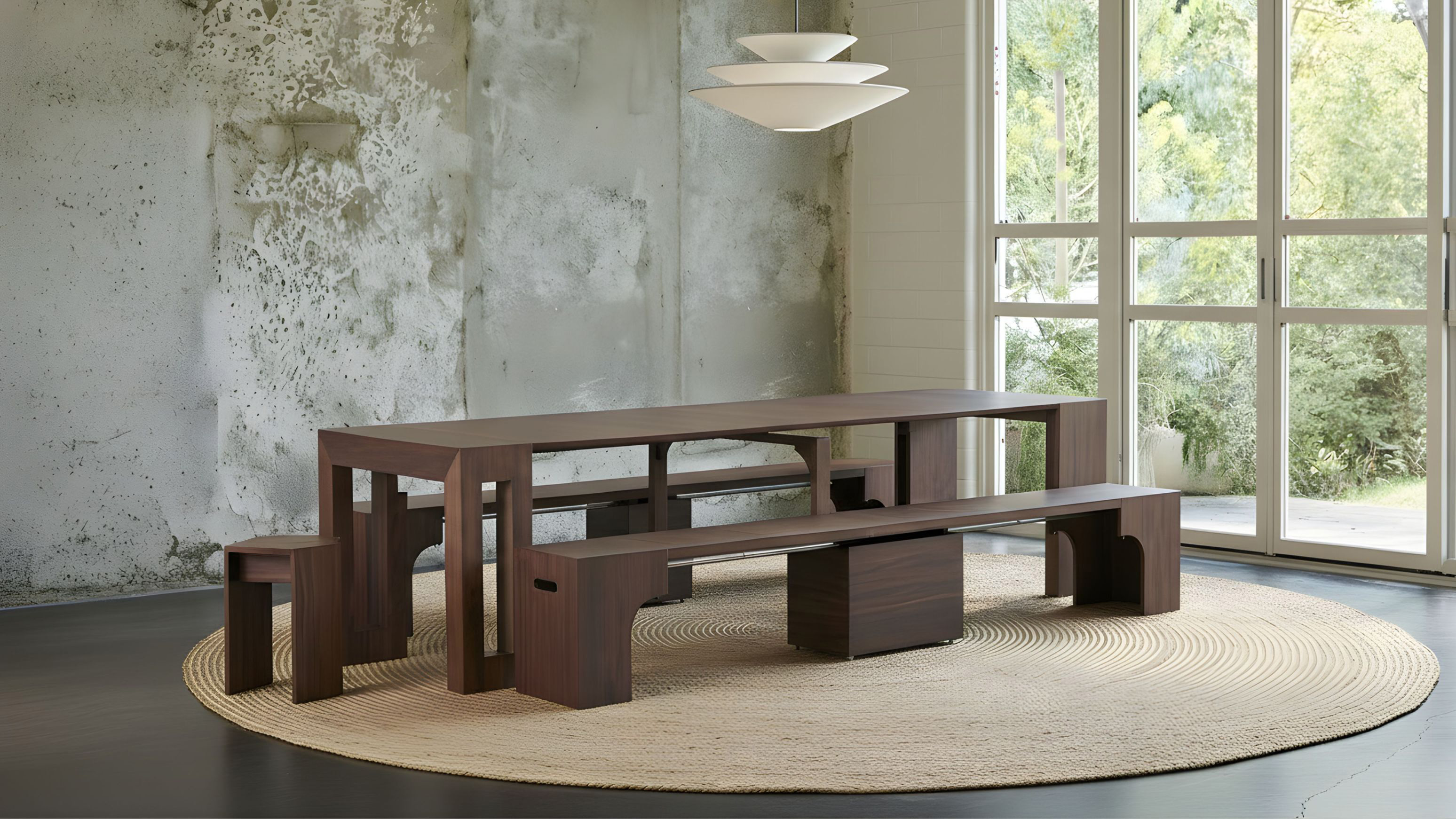 At the core of this concept is the extendable dining table and bench set. In its smaller form, it supports everyday living without occupying unnecessary space. When needed, it expands to accommodate additional seating, making it ideal for hosting or larger gatherings. This ability to transition between uses makes it a practical solution for both compact and open-plan environments.